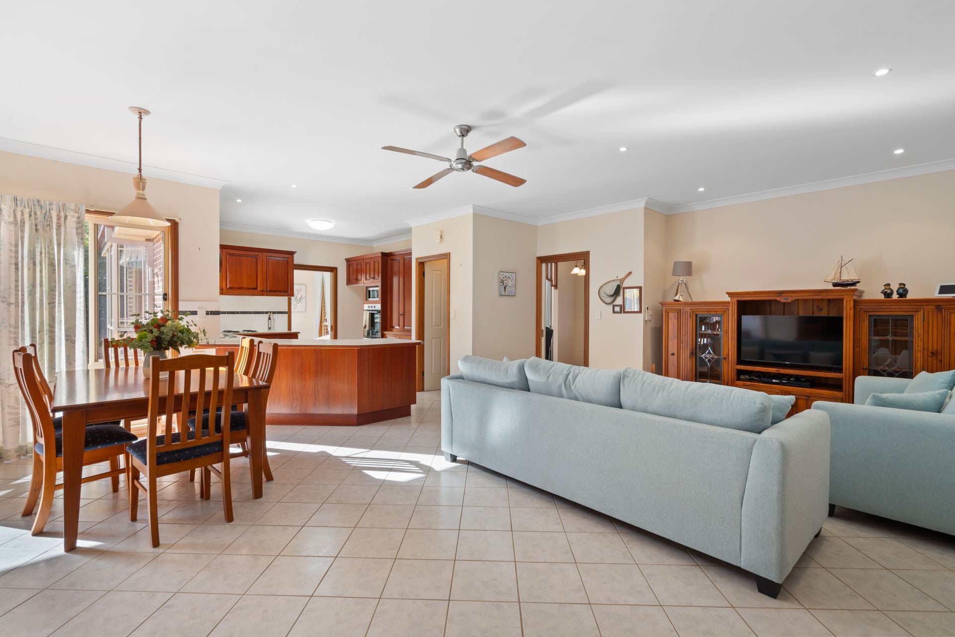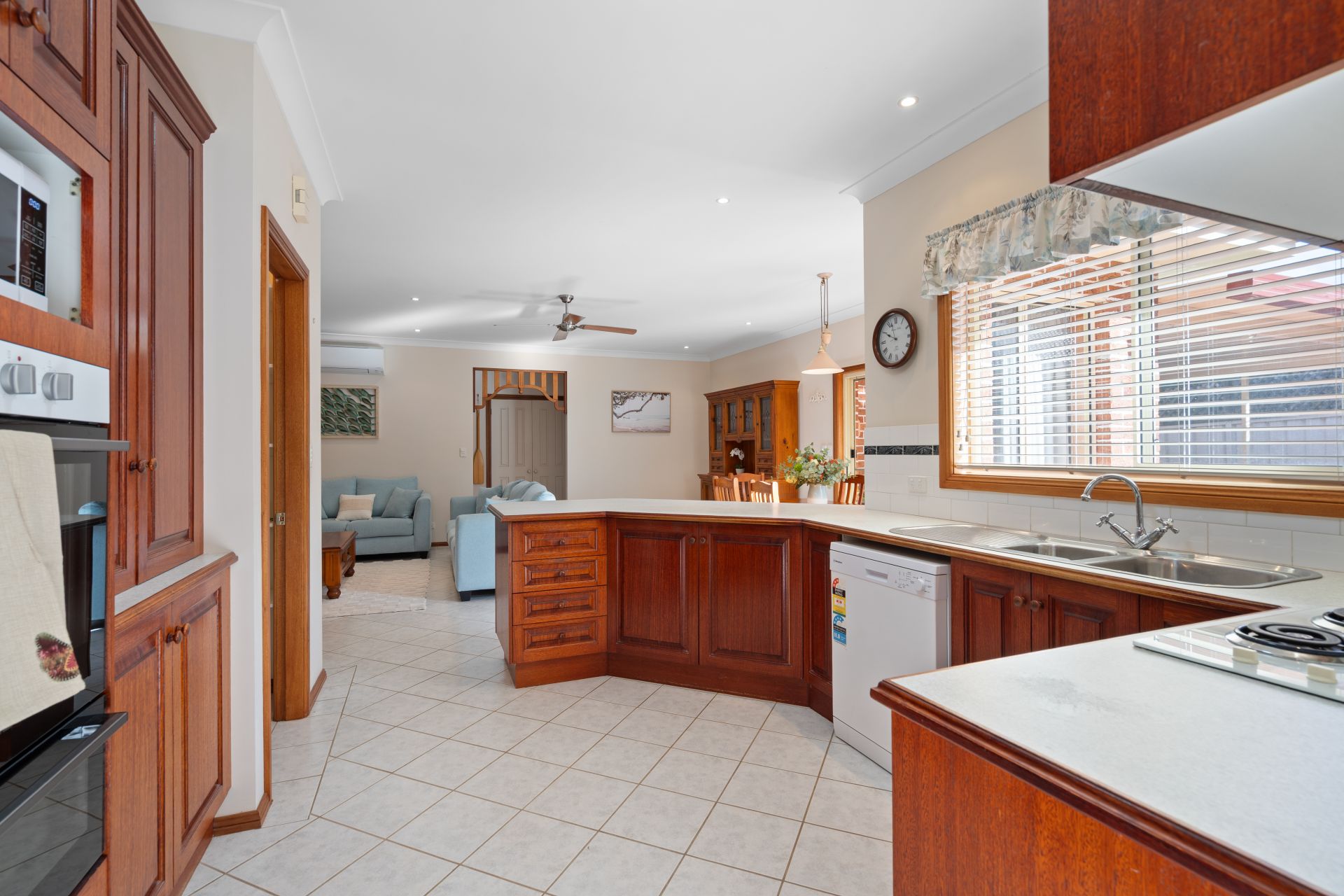 ** Expansive timber kitchen with breakfast bar; dishwasher, electric cooktop & abundant storage