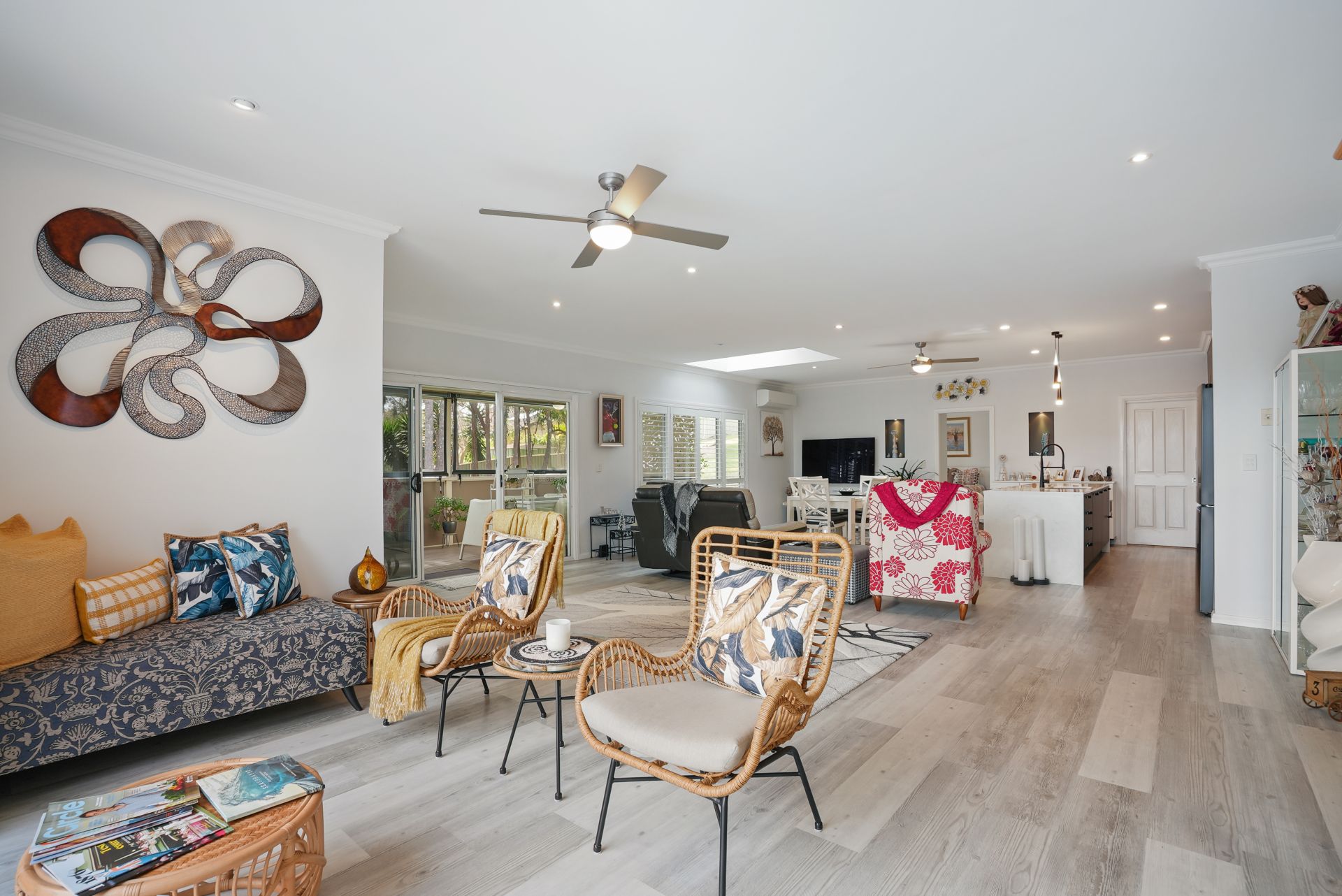 ** Spacious open plan living with A/C, ceiling fans & skylight, overlooking pool