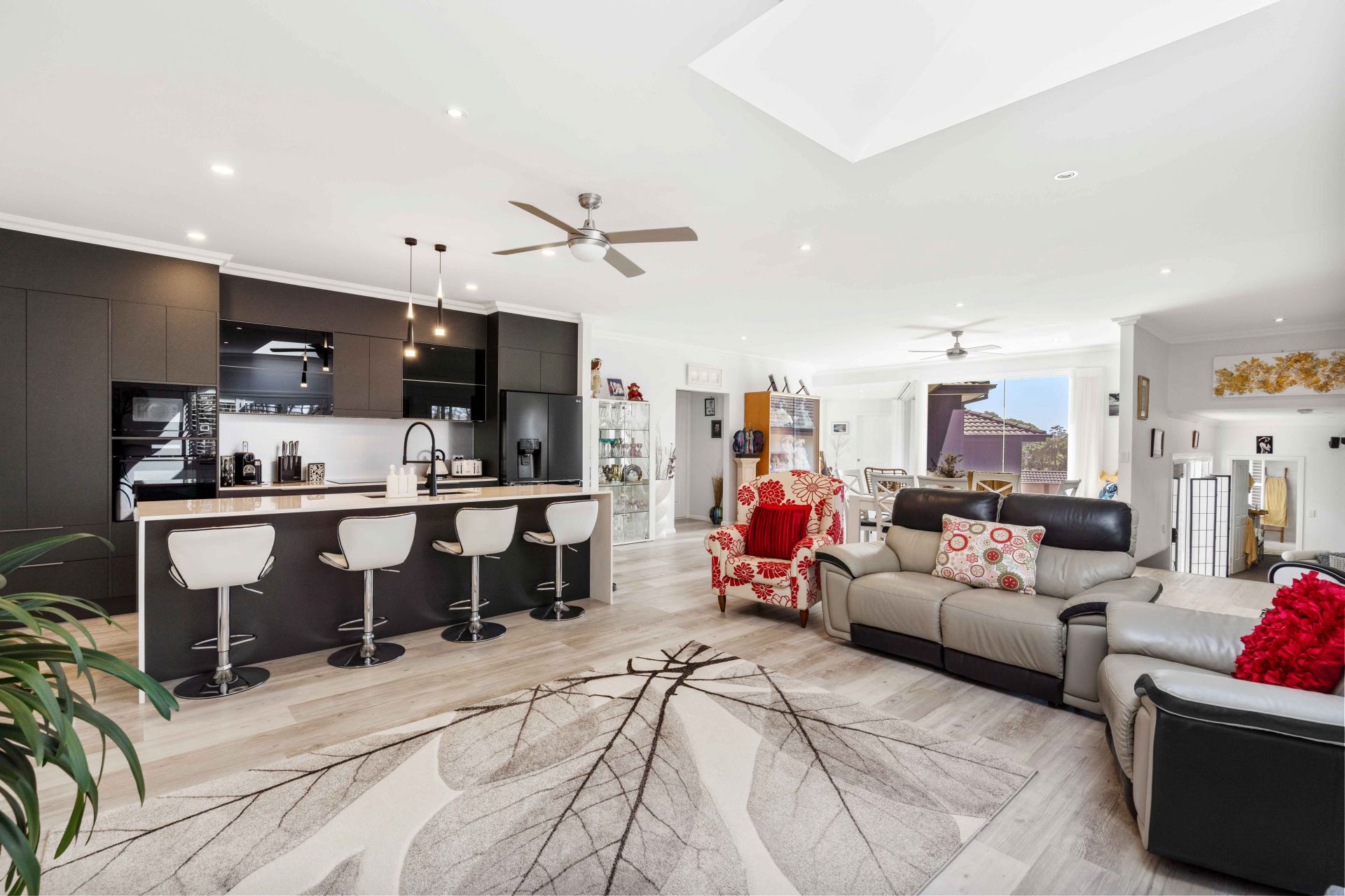 Step inside to the light-filled open plan living space, enhanced by air conditioning, ceiling fans and a feature skylight. At its heart sits the modern kitchen, finished with sleek stone benchtops, quality stainless steel appliances, an integrated dishwasher, and a large island bench that makes cooking and hosting effortless. This central hub overlooks the sparkling pool, creating a true entertainer's outlook.