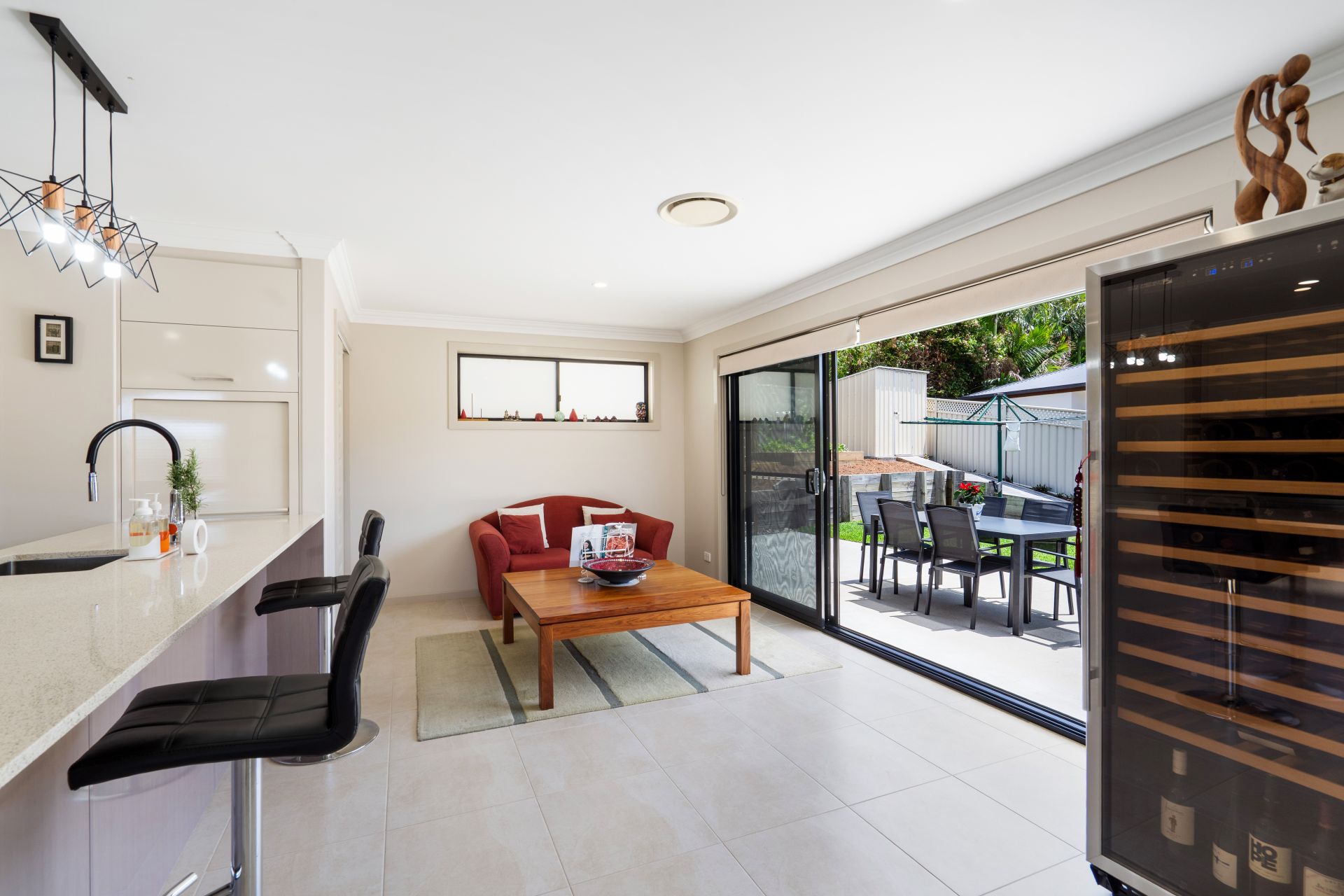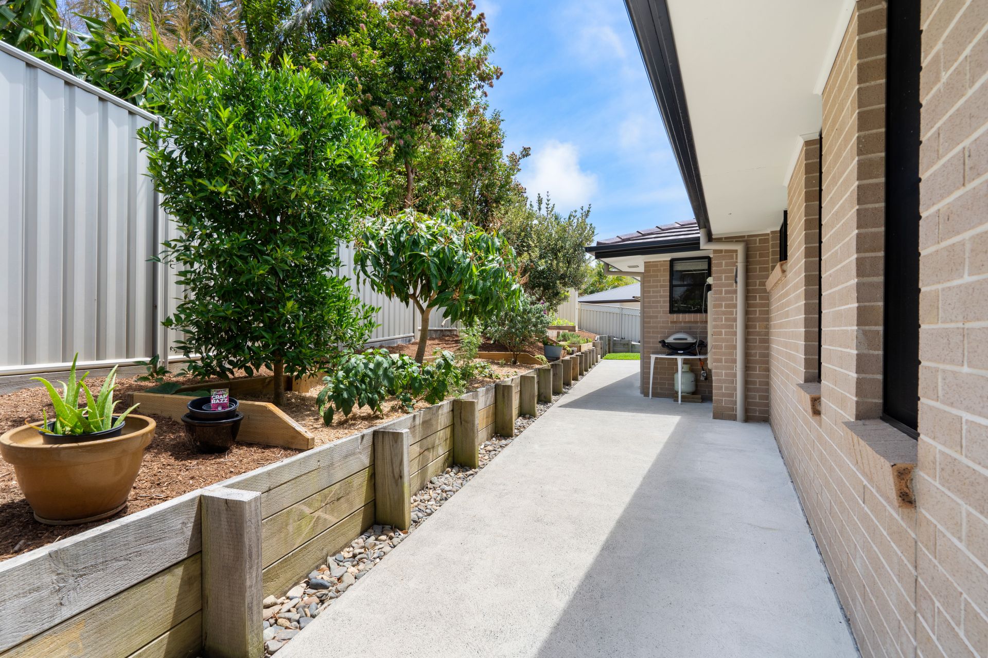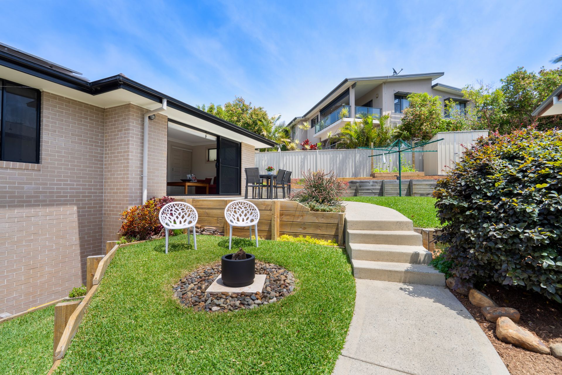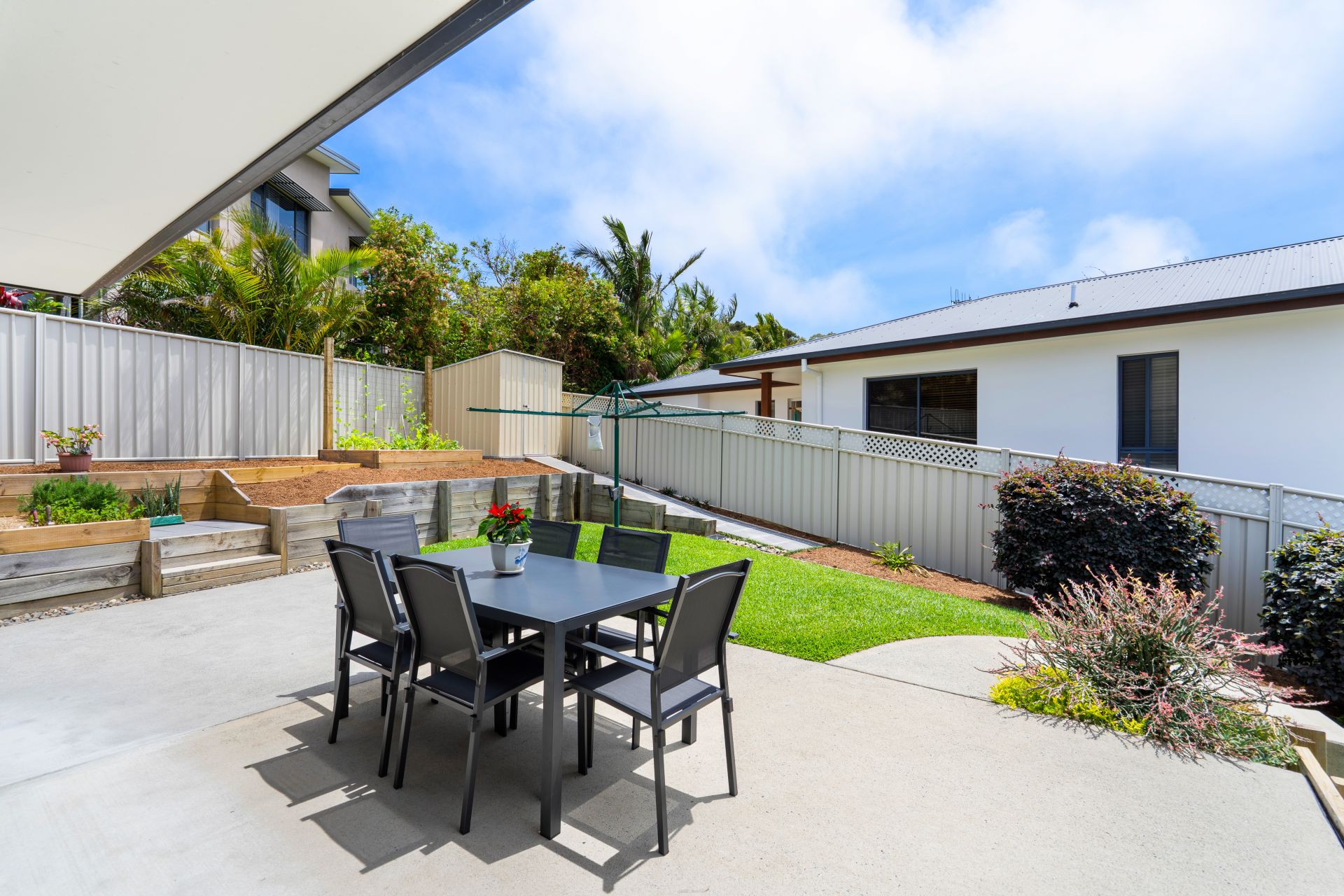 Glass sliding doors extend the living space to a sunny alfresco area overlooking the landscaped, tiered yard — the perfect backdrop for outdoor dining, weekend barbecues or simply enjoying Forster’s coastal breezes. A garden shed provides handy storage for tools and equipment, completing this low-maintenance outdoor retreat.