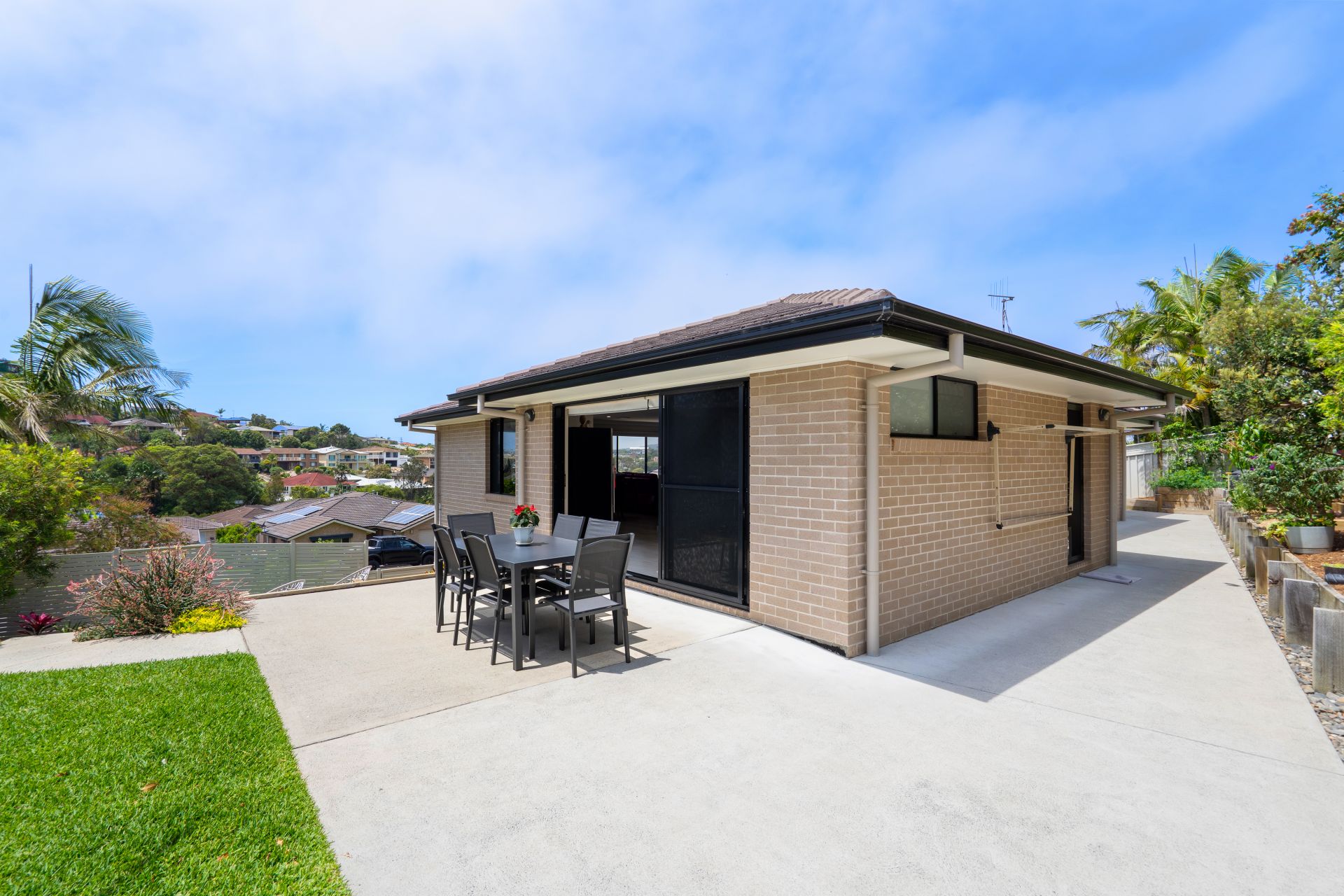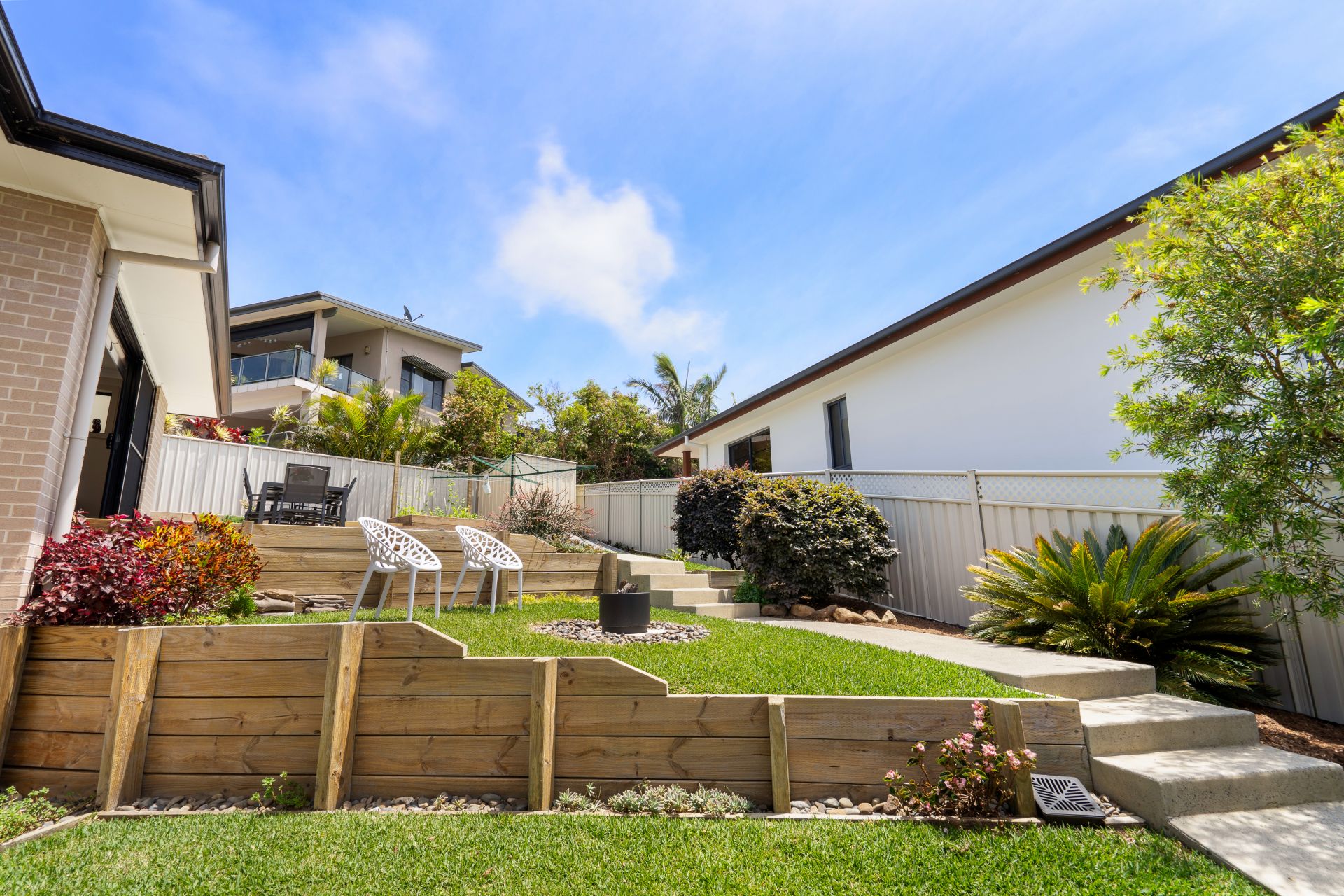 ** Sunny alfresco area overlooking landscaped, tiered yard