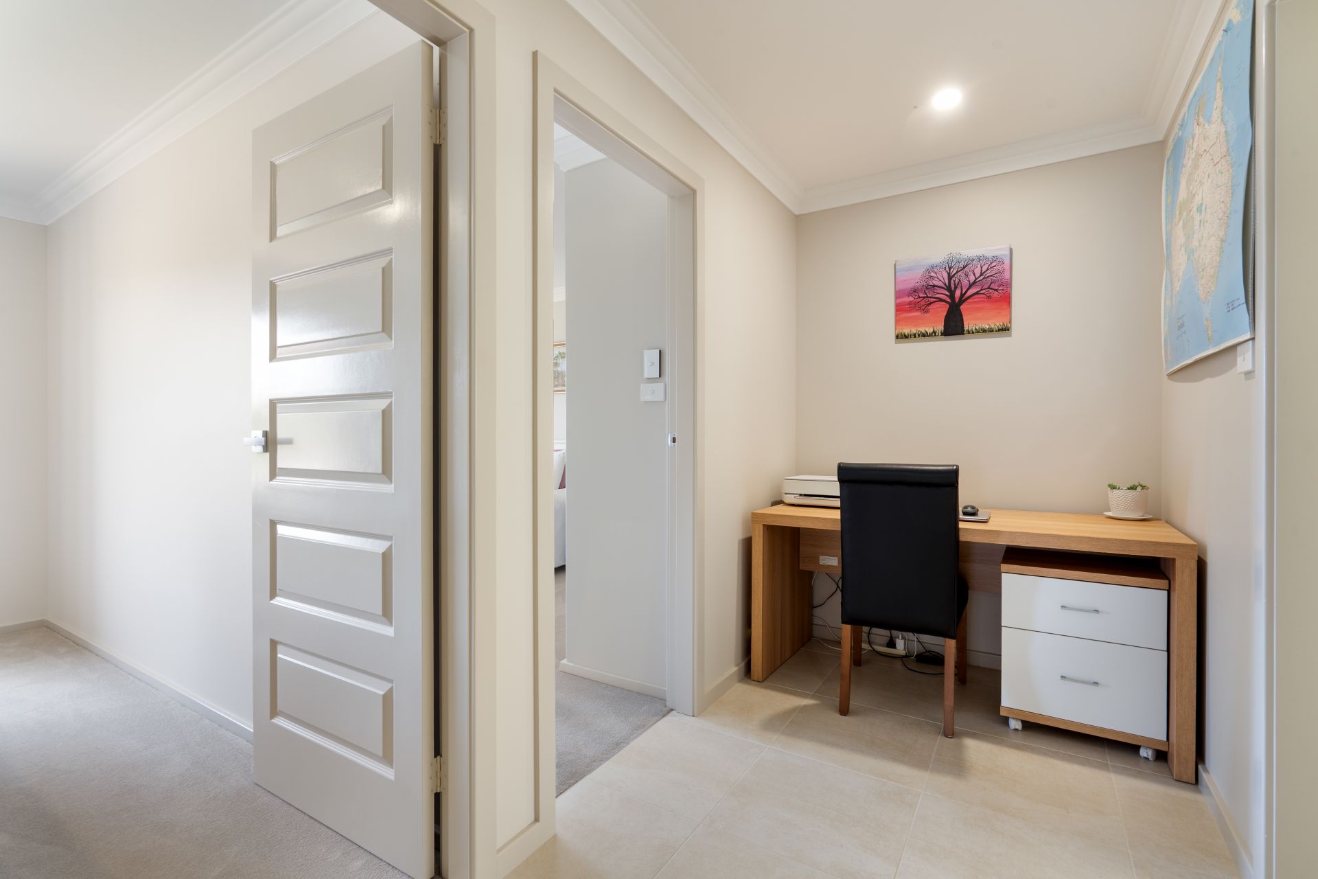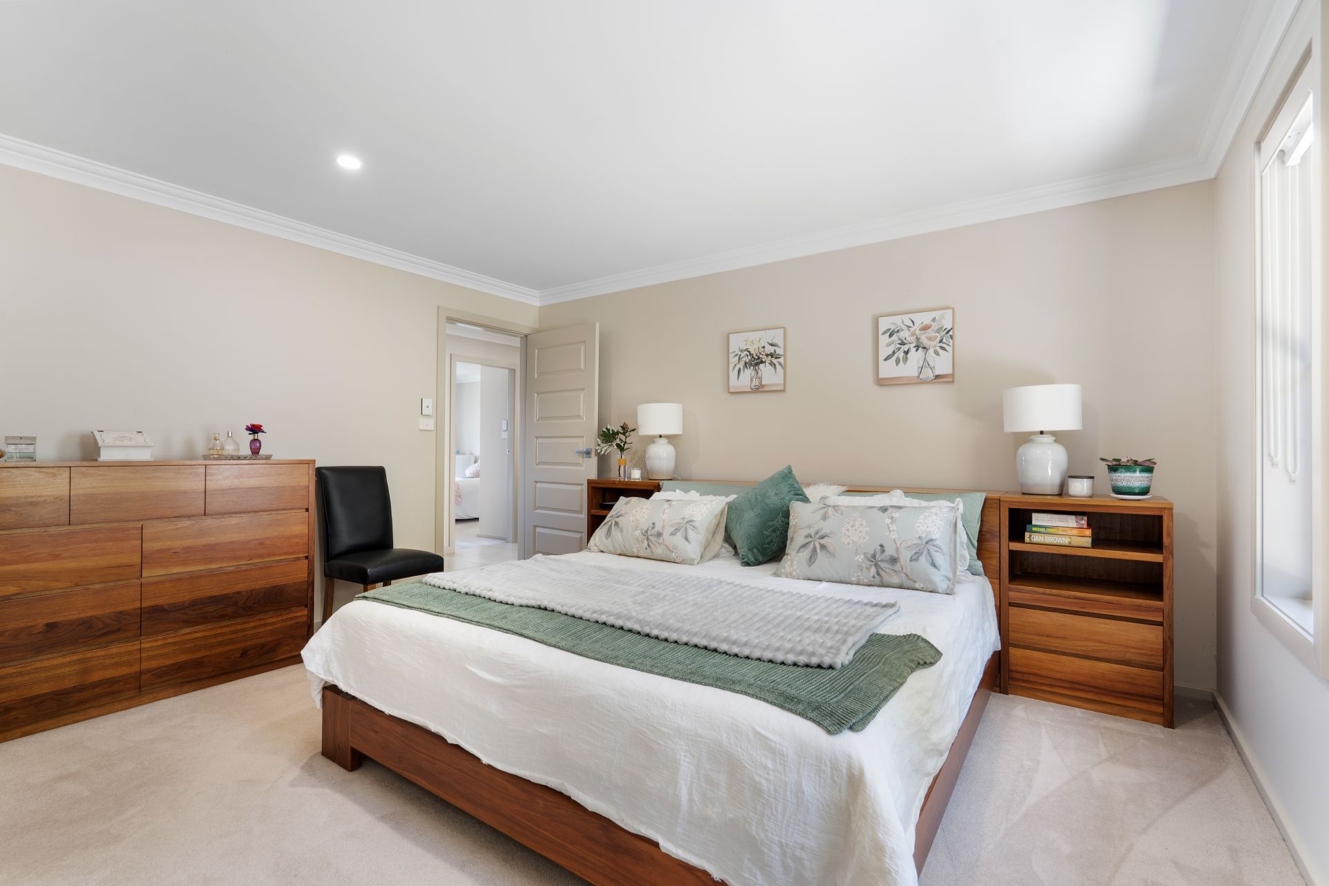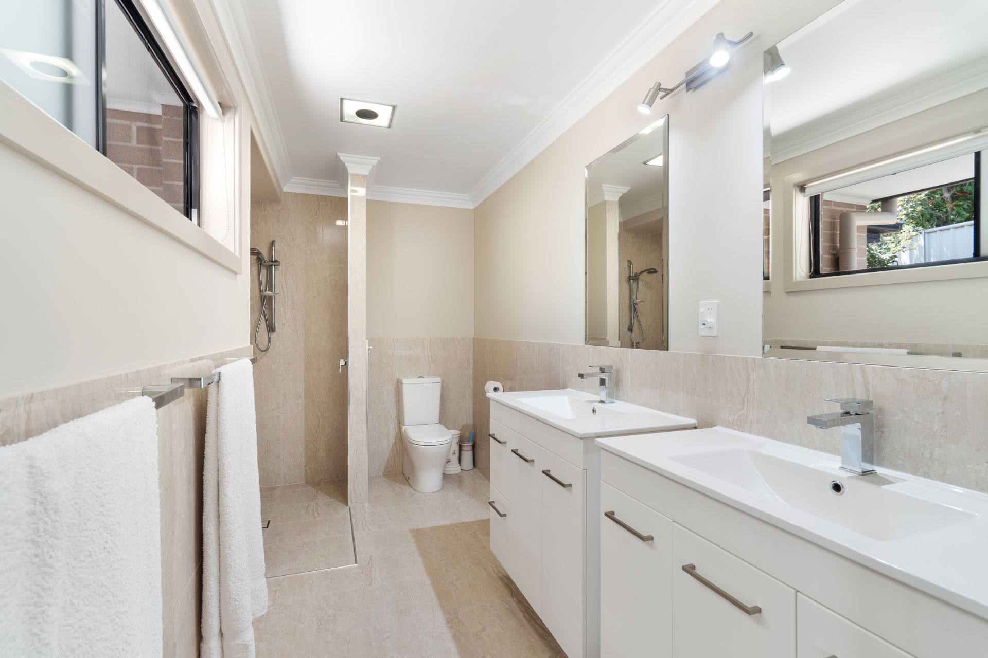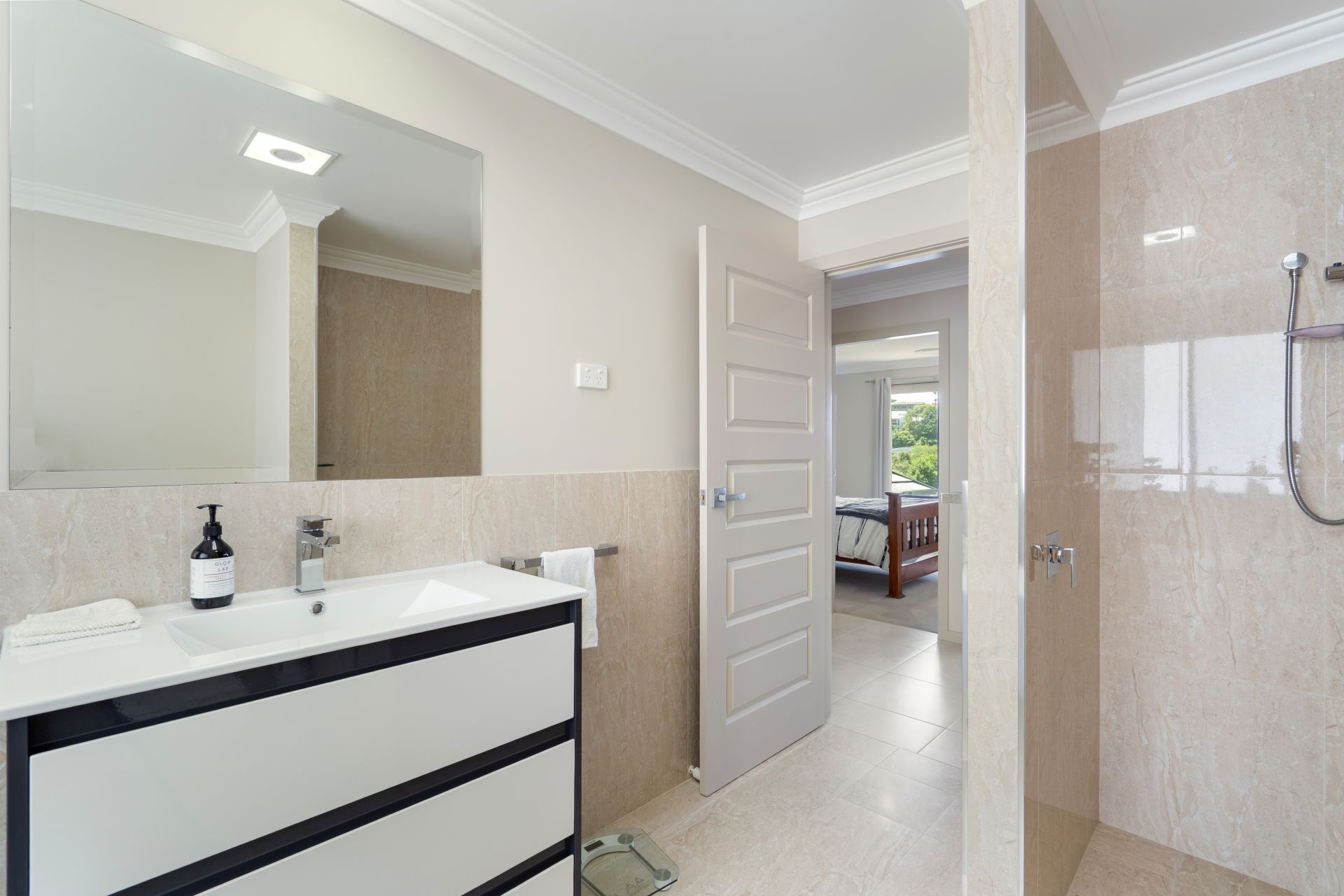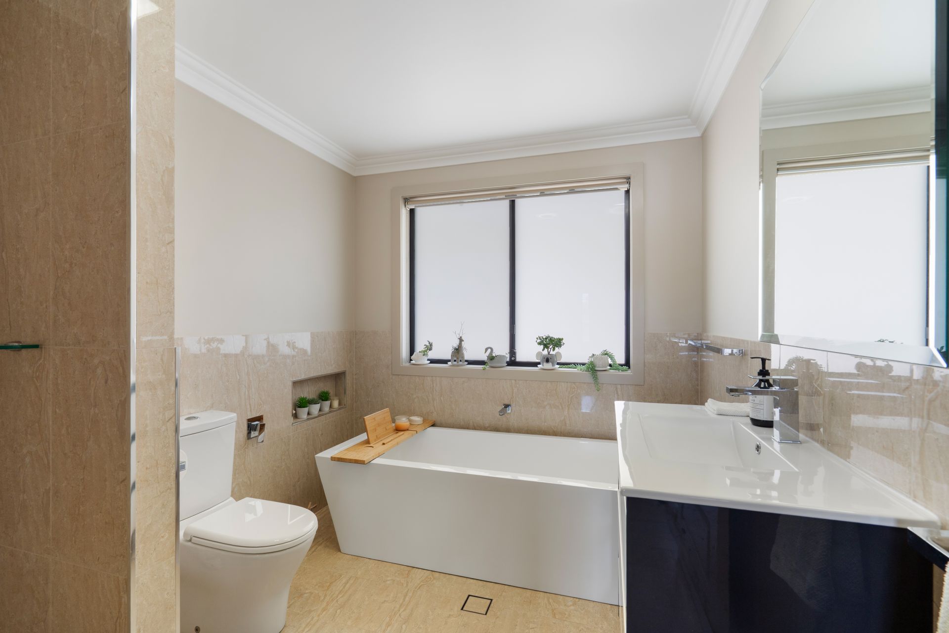 Accommodation is equally appealing, with three generous bedrooms. The master suite features a walk-in robe and a private, modern ensuite complete with dual vanities. The remaining bedrooms include built-in wardrobes and are serviced by a stylish main bathroom boasting a freestanding bath and open-plan design.