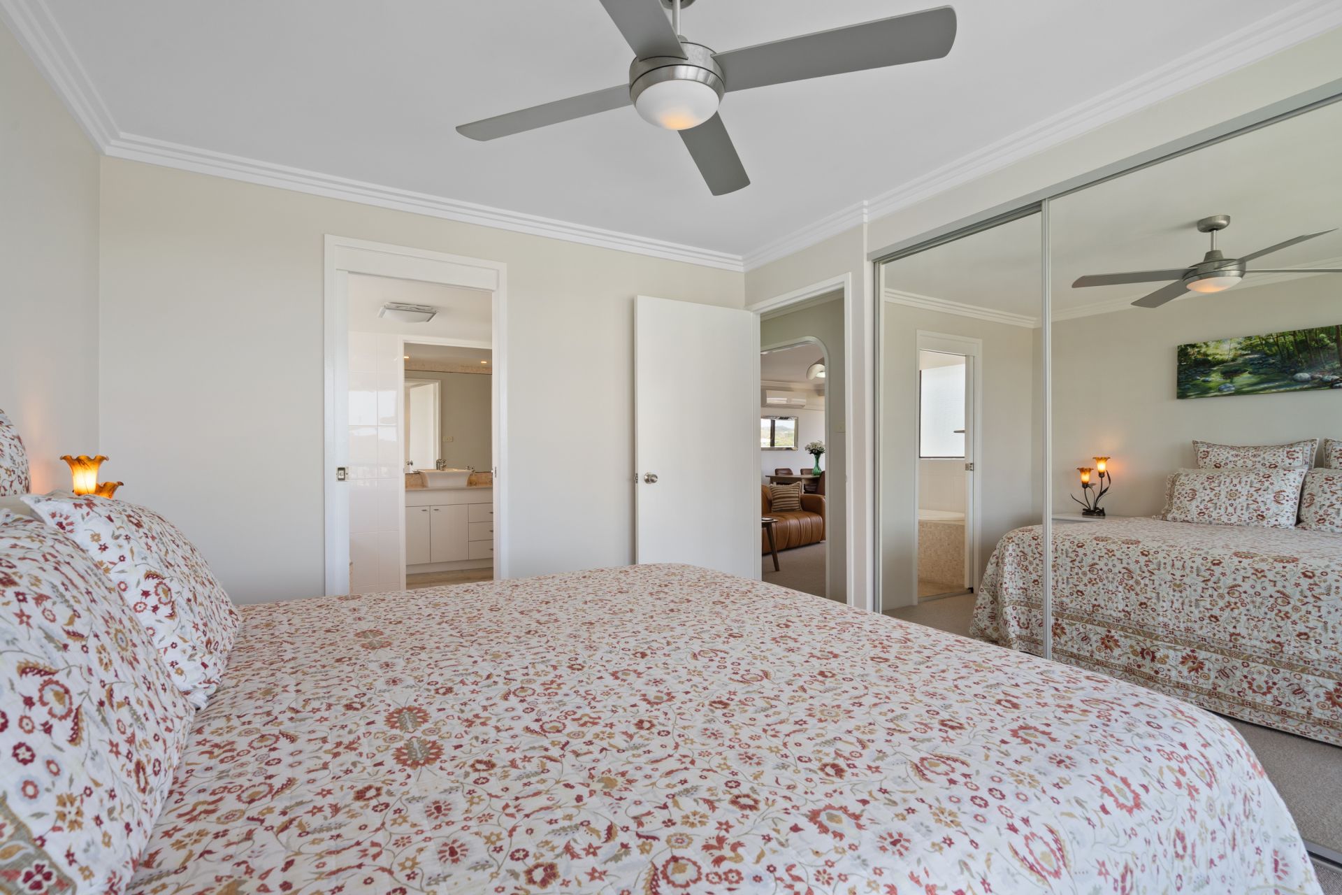 Back inside, the accommodation is thoughtfully arranged. Both bedrooms feature mirrored built-in wardrobes and ceiling fans, and are serviced by a contemporary three-way bathroom offering ensuite-like access from the master bedroom.