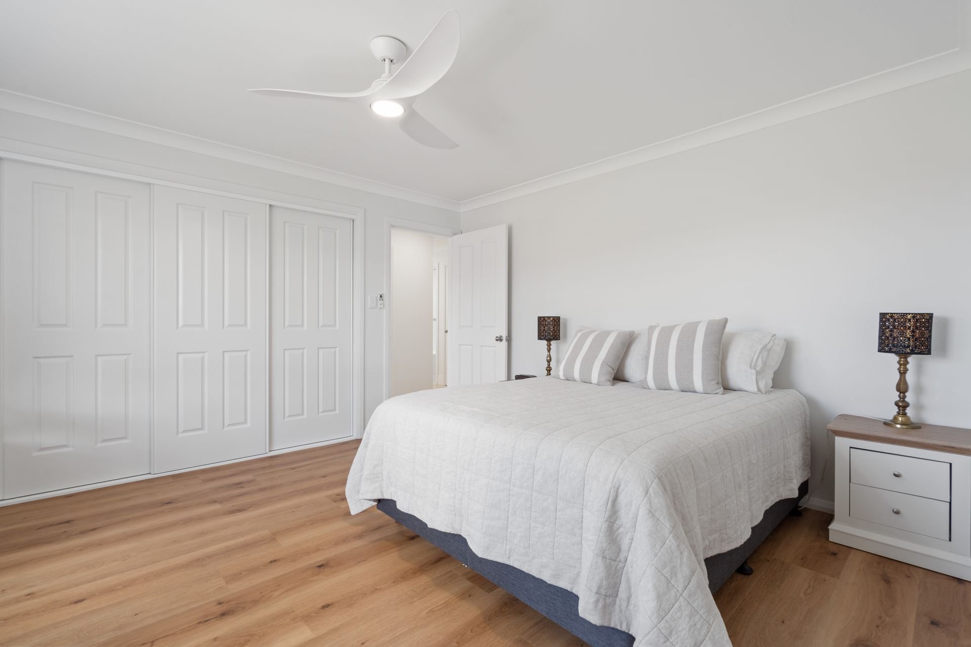 Accommodation is generous, with three well-sized bedrooms all featuring built-in wardrobes and ceiling fans. The master bedroom is a standout, boasting two walls of built-in robes and a private ensuite. Bedrooms two and three are serviced by a practical three-way family bathroom, ideal for guests and everyday convenience.