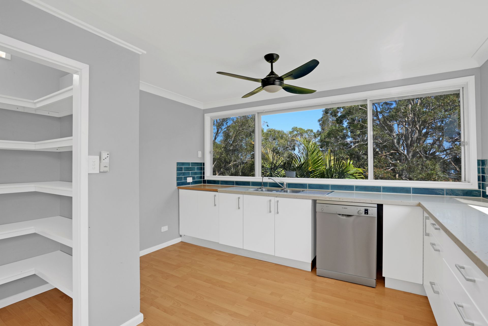 Perched privately on the peak of a 778sqm block, the home boasts a large lounge room enhanced by a fireplace, ensuring warmth and ambience throughout the cooler months. An open-plan dining and kitchen zone forms the central hub of the home, with stone benchtops, a dishwasher and a freestanding cooktop ensuring everyday practicality.
