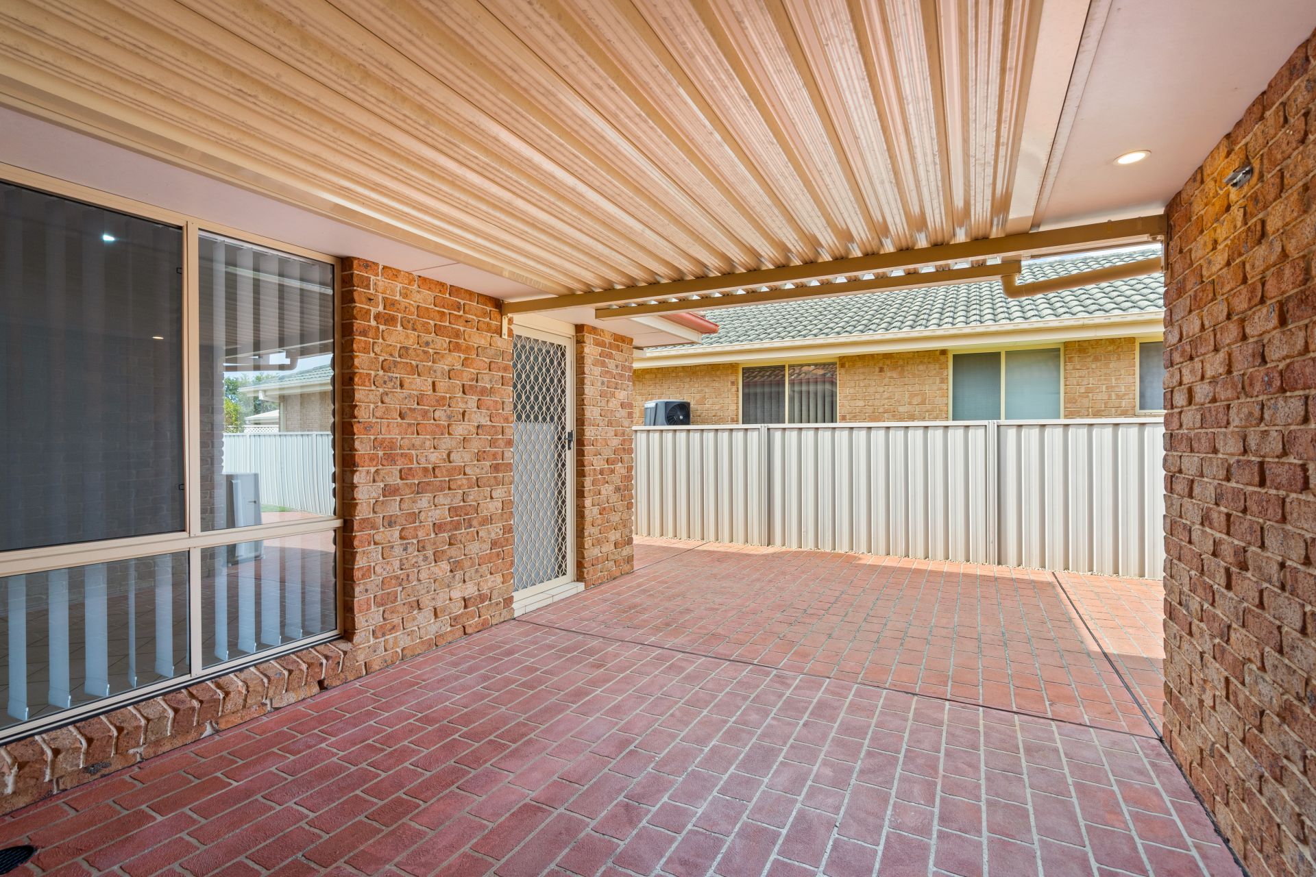 ** Covered alfresco area overlooking level, low-maintenance yard with garden shed