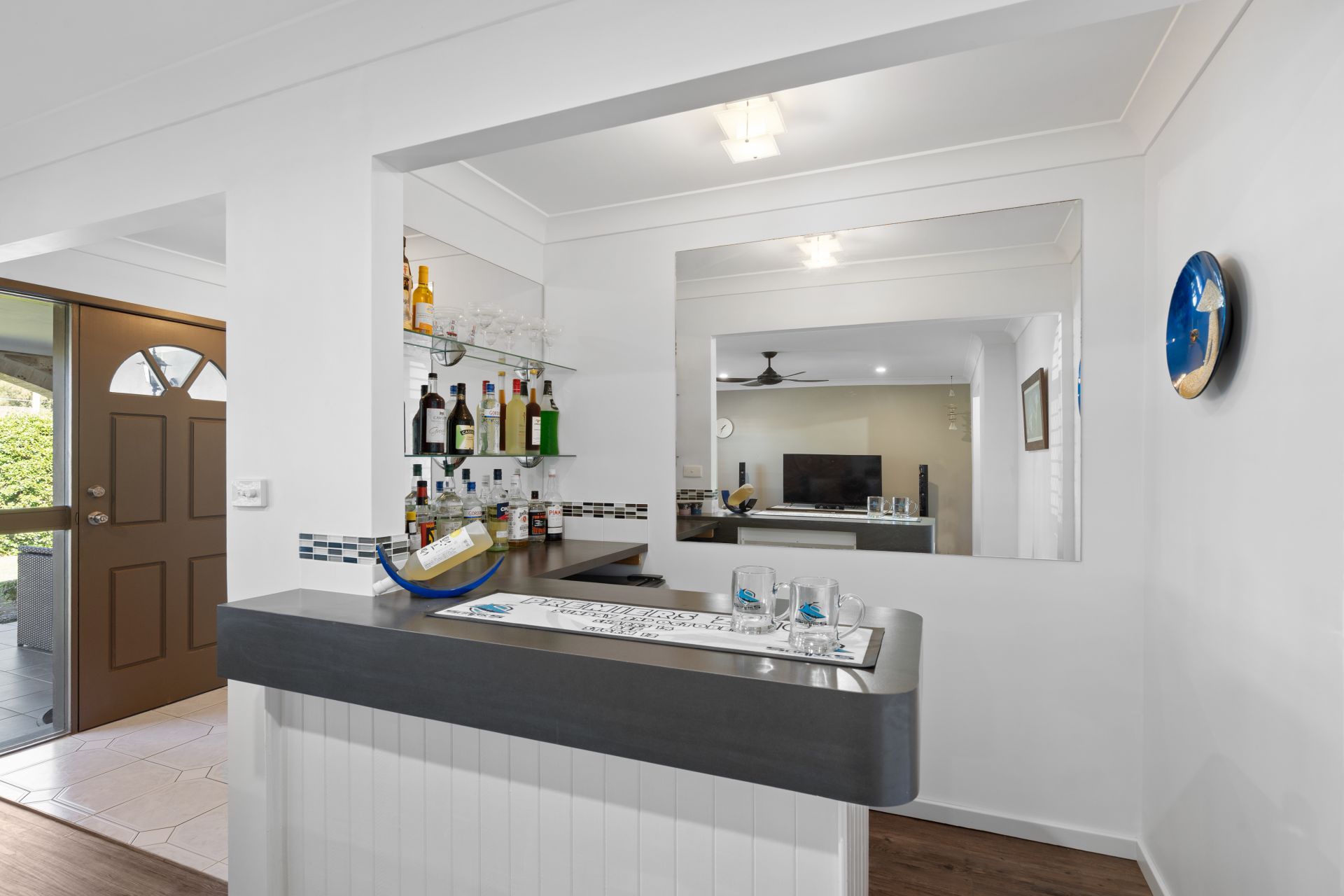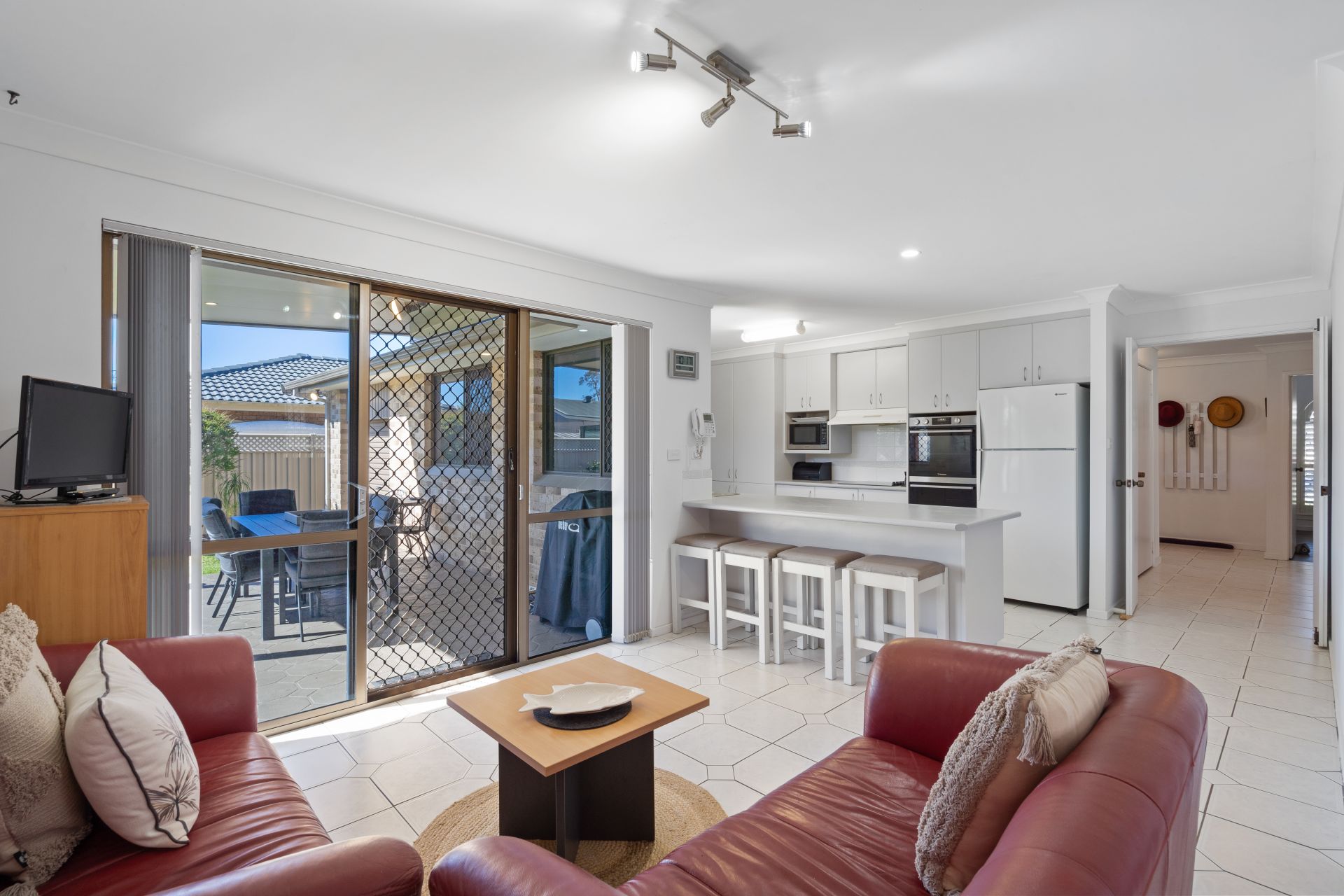 Upon entry, the open plan lounge with bar area and adjoining formal dining space offers a welcoming retreat. Flowing from here is a large galley-style kitchen, complete with excellent storage, generous bench space and a convenient breakfast bar. Electric appliances include a cooktop and oven with separate grill.
