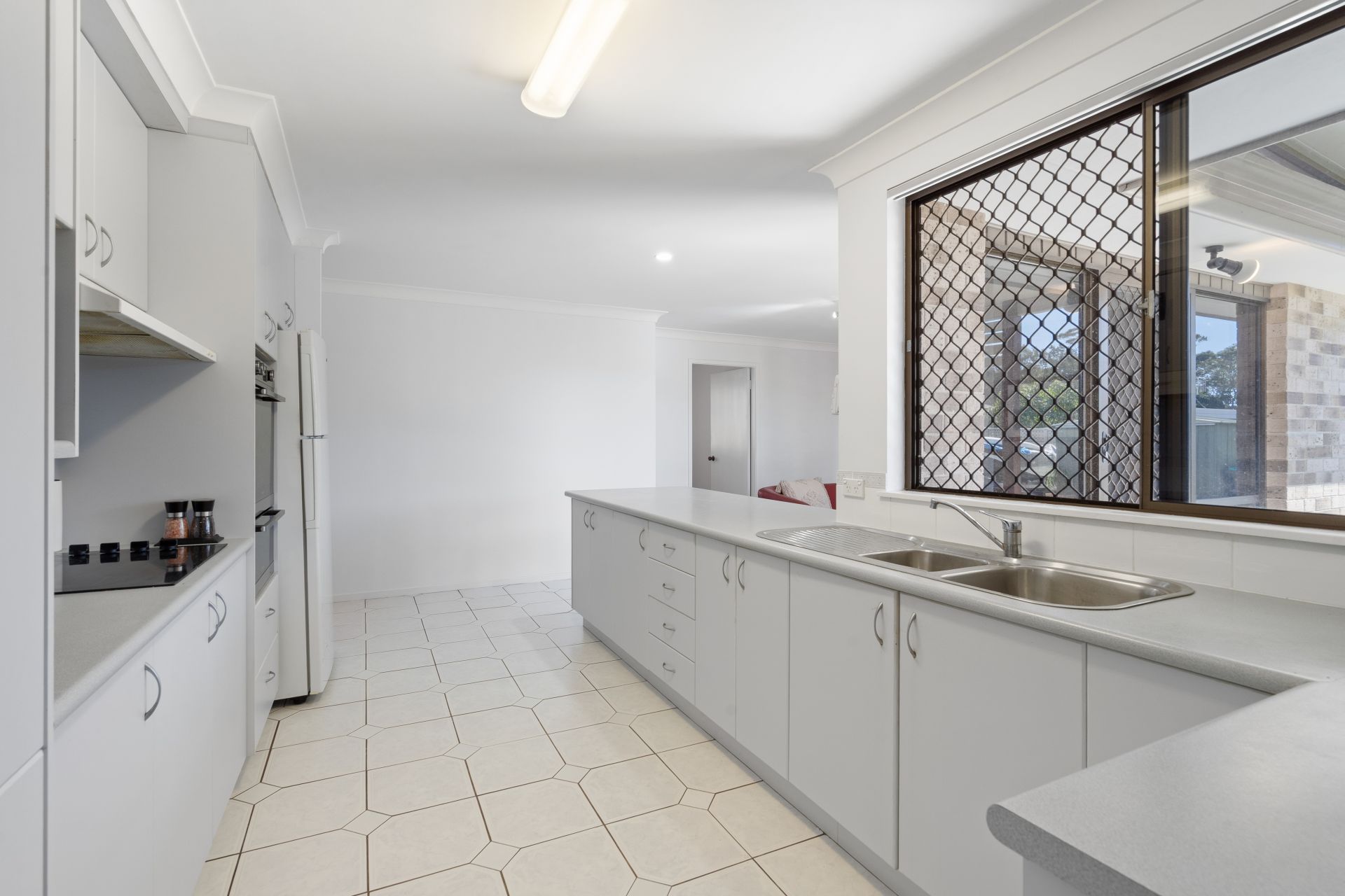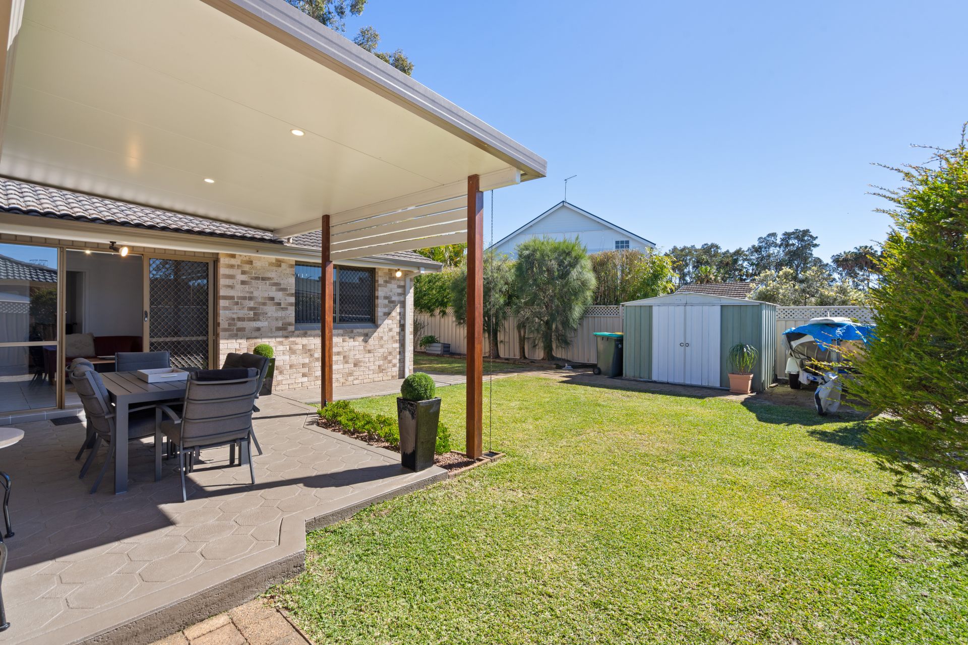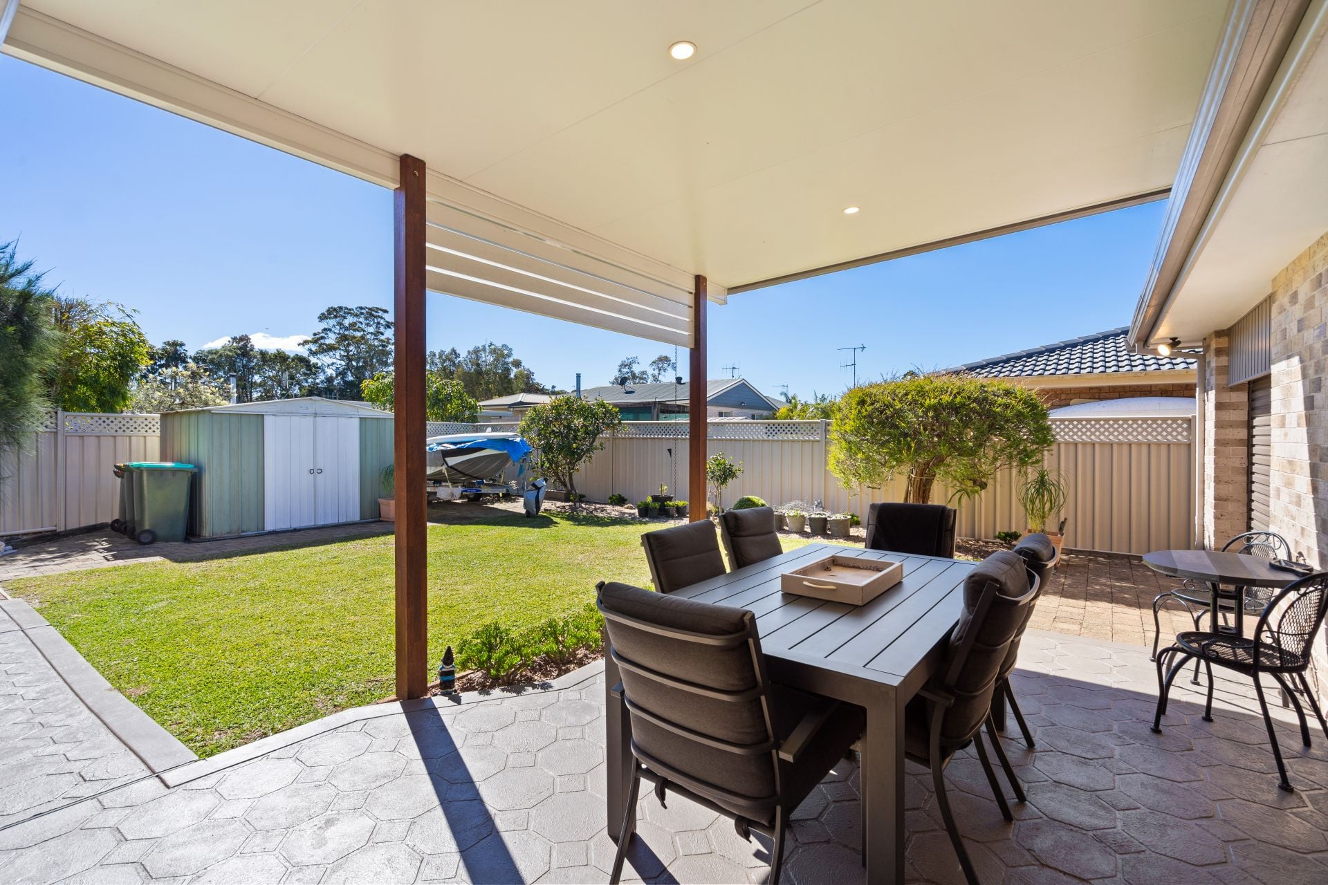 The kitchen connects seamlessly to a second family area, providing flexibility for entertaining or relaxation. Glass sliding doors open to a covered alfresco zone overlooking the level, low-maintenance yard, complete with a garden shed for practical storage.