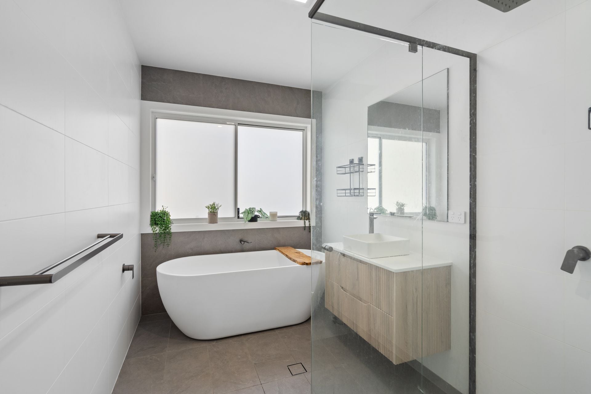 Accommodation is thoughtfully designed for comfort and privacy. The master suite is positioned at the front of the home and features a spacious ensuite with double vanity, separate toilet and a walk-in robe. Bedroom two also enjoys the luxury of a walk-in robe and its own private powder room, while the remaining bedrooms include built-in wardrobes and are serviced by a stylish family bathroom complete with a freestanding bath and separate toilet.