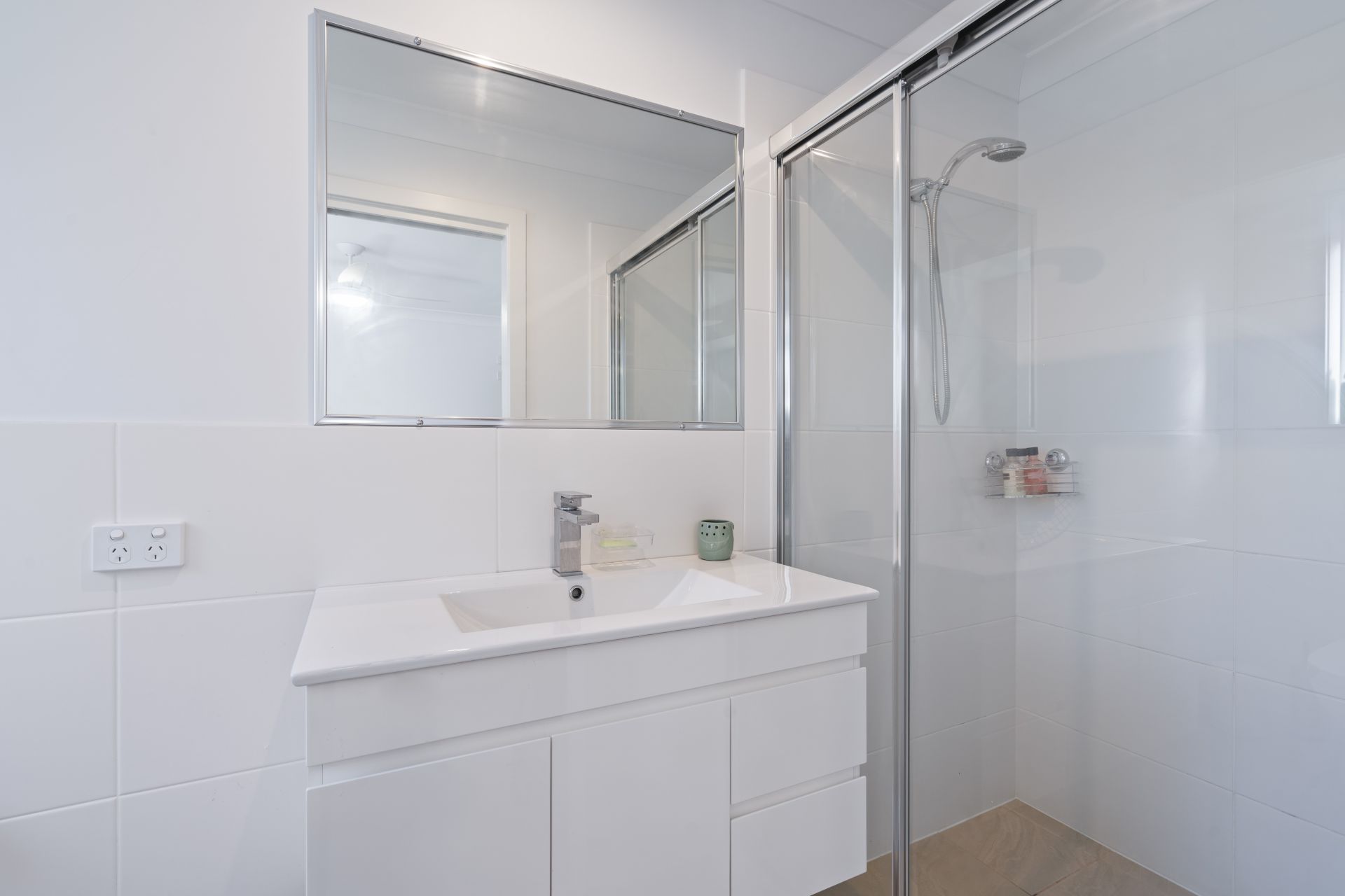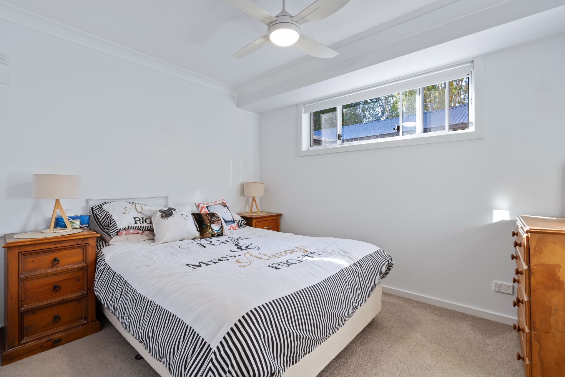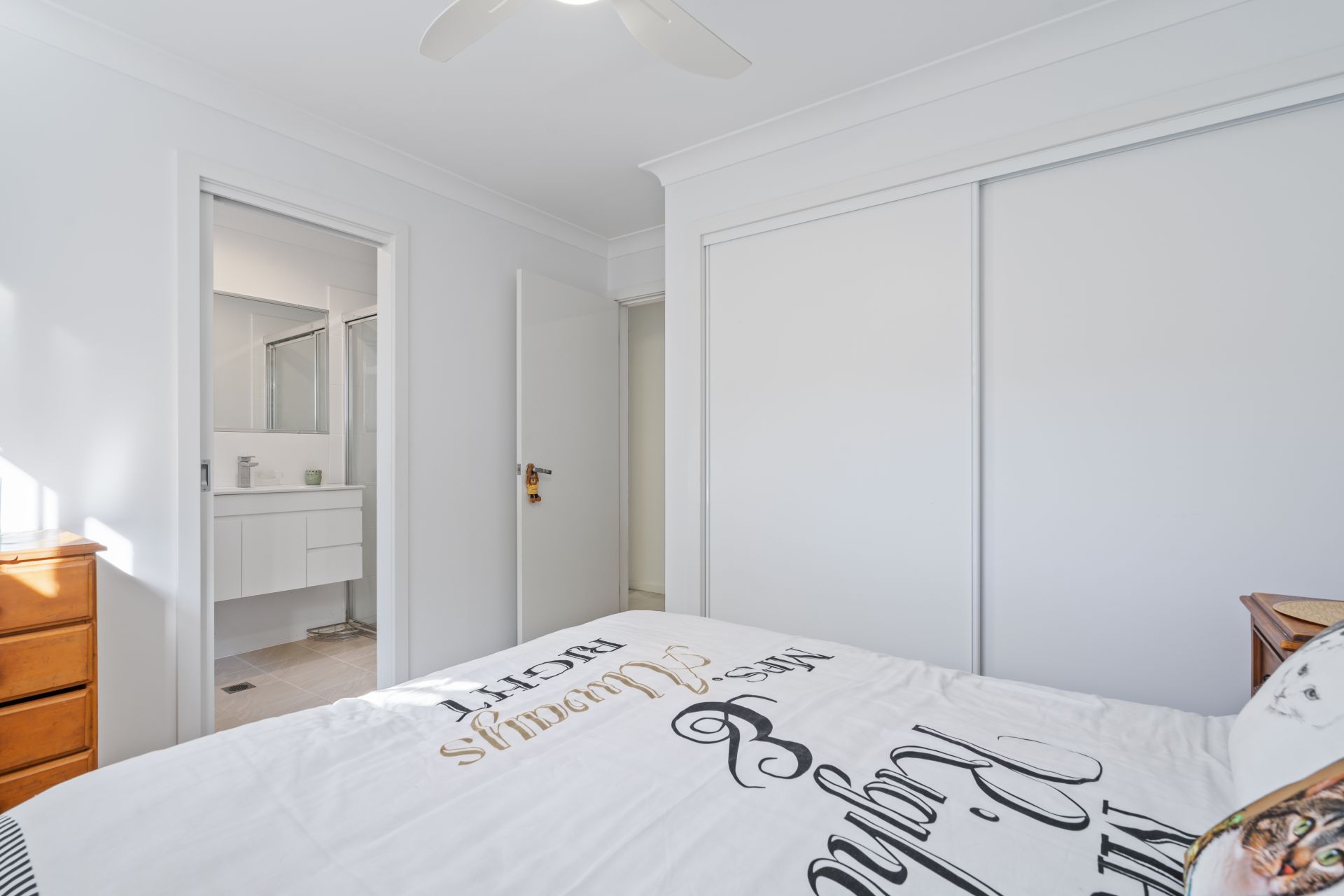The villa features three bedrooms with built-in wardrobes, including a master suite with an ensuite. The remaining two bedrooms share a well-appointed family bathroom, both offering ample storage and comfort. Ceiling fans throughout and a split system air-conditioning unit in the living zone ensure year-round comfort throughout the villa.