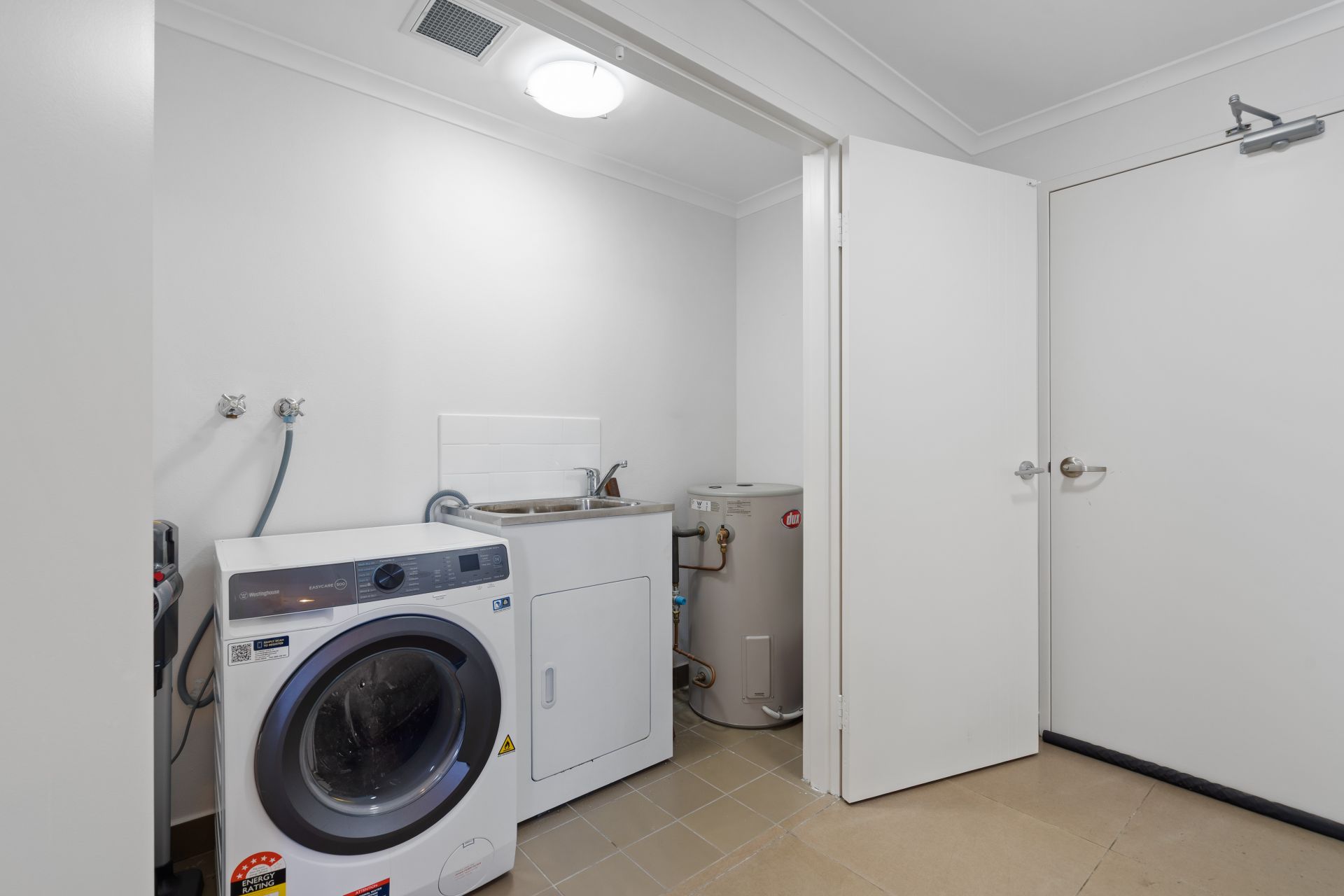 ** Stylish main bathroom with bathtub; European-style laundry