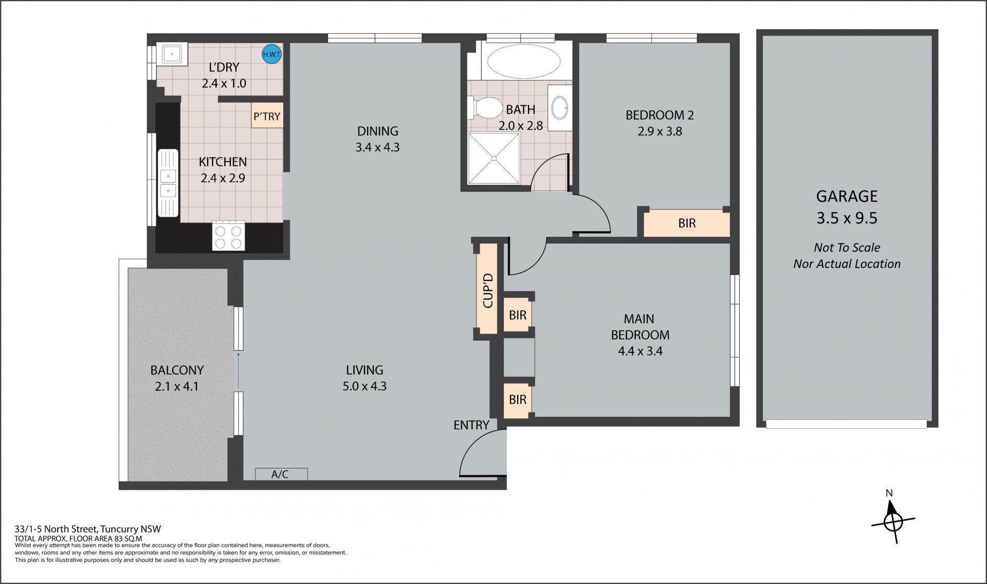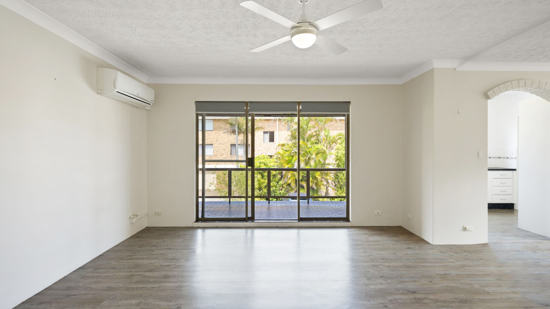 ** Light-filled open plan living with A/C, tidy kitchen & sizeable balcony